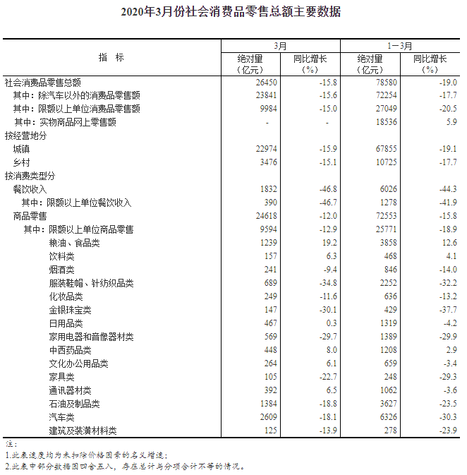 消費方面,3月份,社會消費品零售總額26450億元,同比下降15.8%(扣除價格因素實際下降18.1%,以下除特殊說明外均為名義增長),降幅比1-2月份收窄4.7個百分點。其中,除汽車以外的消費品零售額23841億元,下降15.6%。